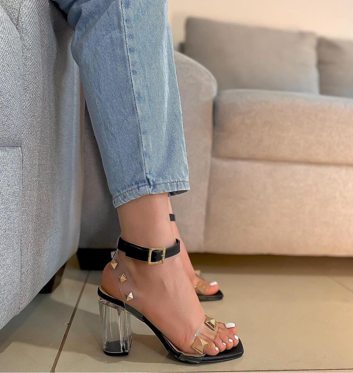 Eleva tu estilo con nuestros Pirámides Capellada, un diseño moderno y versátil que combina tiras transparentes con apliques dorados en forma de pirámides. Su tacón cristal aporta un efecto elegante y ligero, perfecto para cualquier ocasión.